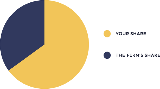 Unlike a traditional law firm, Pact pays attorneys a percentage of client fees. Where a traditional firm offers lawyers a salary that’s 1/3 of the value they create, Pact attorneys make a percentage of both collected origination and matter responsible fees.